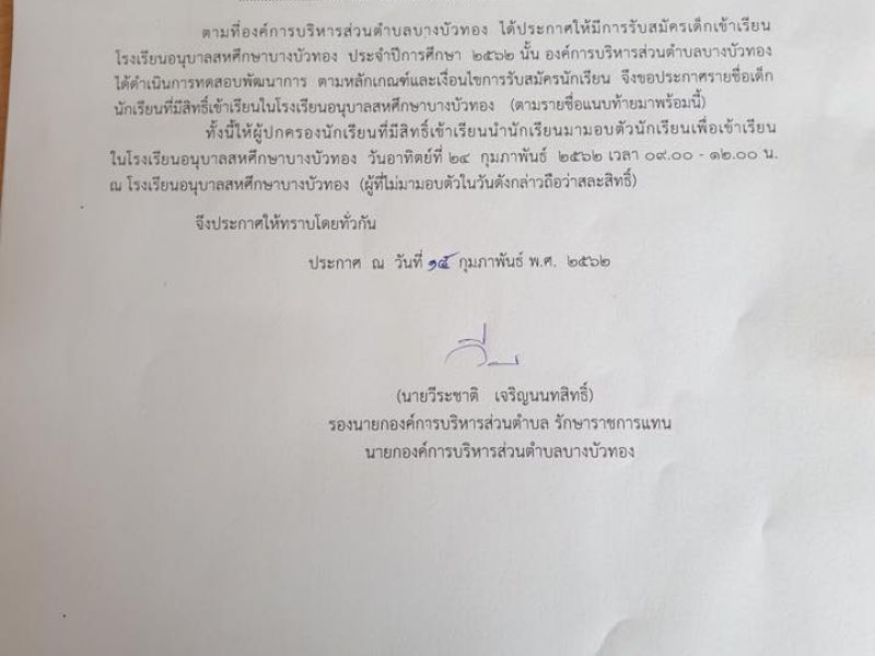 ประกาศรายชื่อนักเรียนที่สิทธิ์เข้าเรียนโรงเรียนอนุบาลสหศึกษาบางบัวทอง ประจำปีการศึกษา 2565 ...